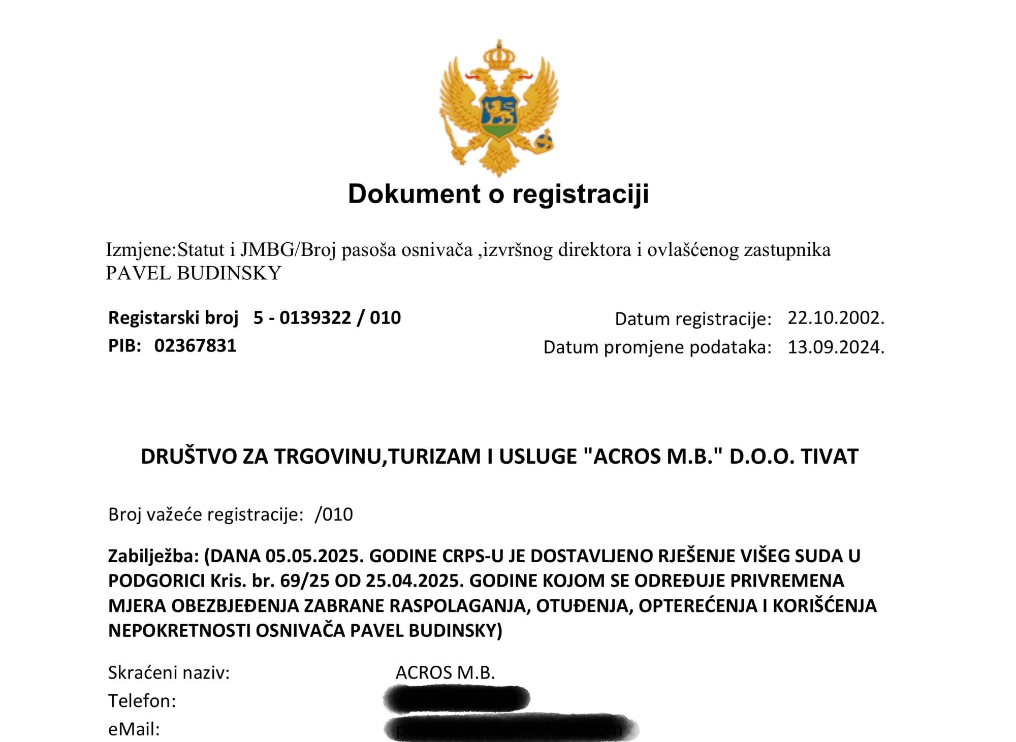 “Dne 5.5.2025 bylo CRPS (černohorský obchodní rejstřík - pozn. red.) předloženo rozhodnutí Vrchního soudu v Podgorici ze dne 25.4.2025, které určuje dočasné opatření k zajištění zákazu likvidace a používání nemovitosti zakladatele Pavla Budinského,” stojí v dokumentu.