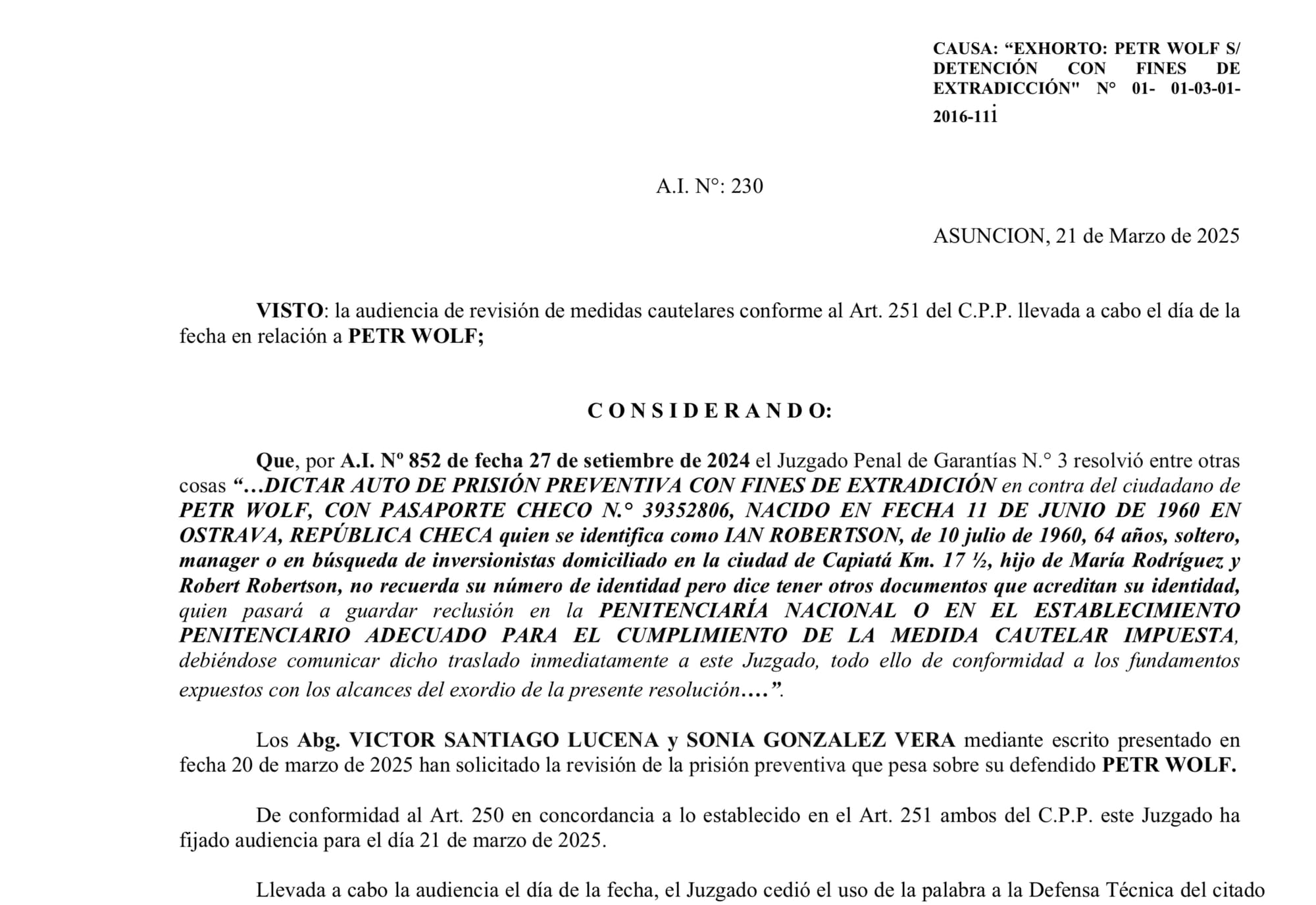 Redakce Odkryto.cz nyní získala kompletní znění rozhodnutí paraguayského soudu, který o Wolfově případu rozhodoval. Vyplývá z něj mimo jiné to, že se bývalý poslanec při svém zatčení prokazoval falešnou identitou. Jmenoval například i své údajné rodiče.