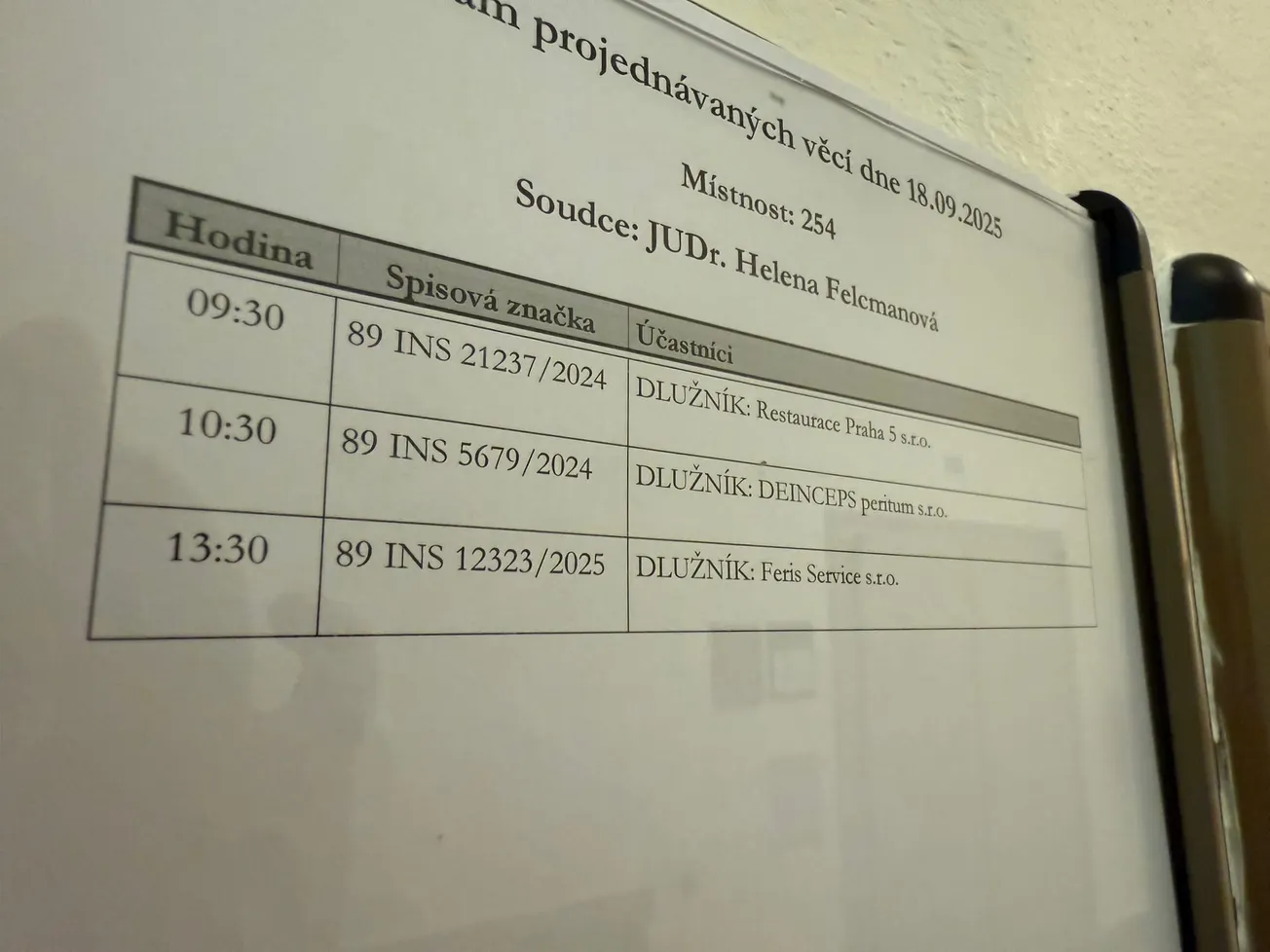 S ohledem na přiznanou absenci jakýchkoliv zaměstnanců soudkyně rozhodla o tom, že v danou chvíli není reorganizace přípustná. Jediným řešením je tak podle Felcmannové vyhlásit úpadek firmy a následně ji poslat do konkursu. O tom hodlá rozhodnout samostatným usnesením, protože zároveň soud musí jmenovat firmě insolvenčního správce.