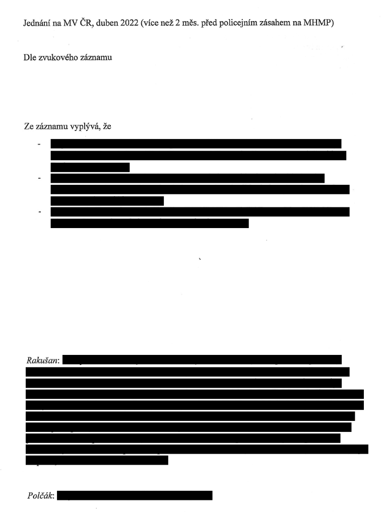 Obsahuje citace ze schůzky, která se údajně odehrála v dubnu 2022 na ministerstvu vnitra a jejími účastníky měli být kromě Rakušana také další tehdejší stranické špičky: Petr Gazdík, Stanislav Polčák, Věslav Michalik a tři další muži (nejde o politiky).